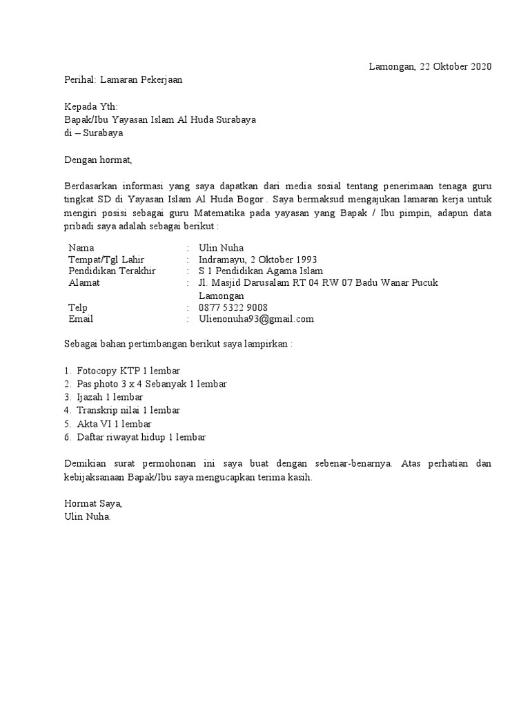 Surat Lamaran Kerja Di Sekolah Yayasan Pdf
